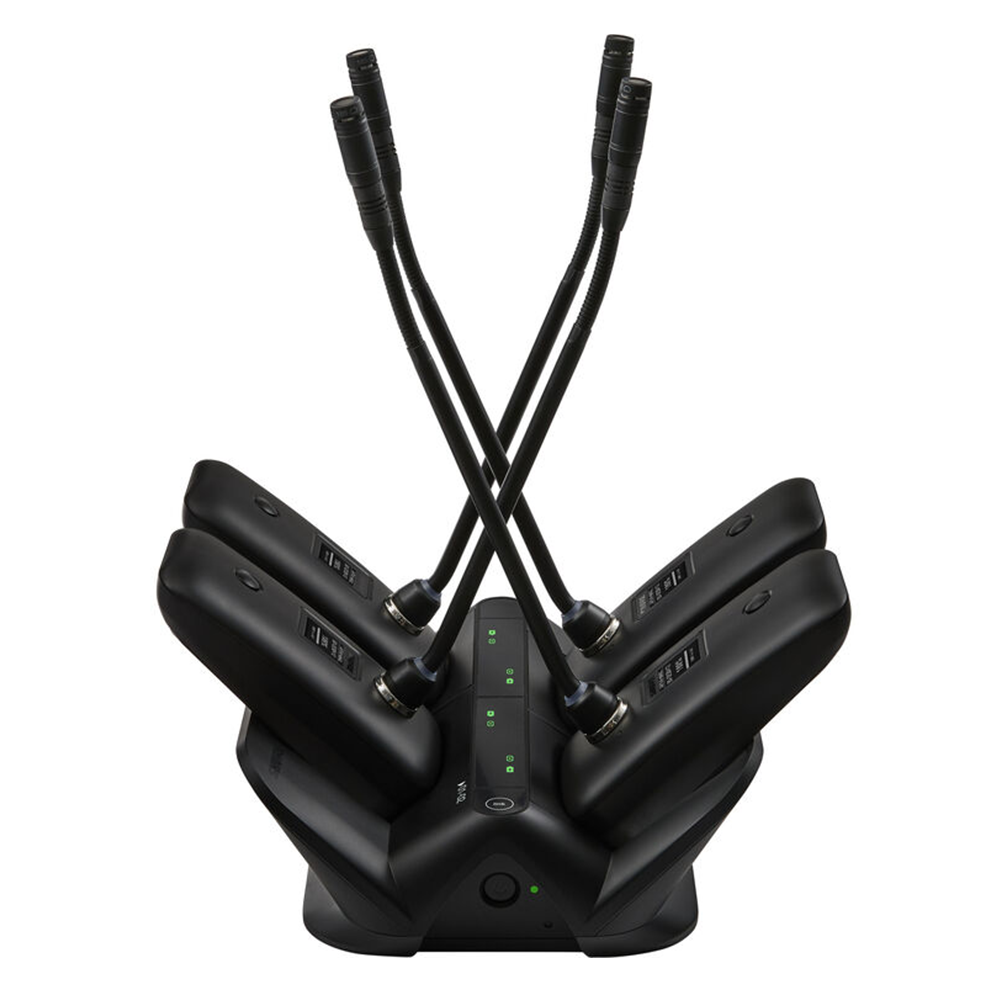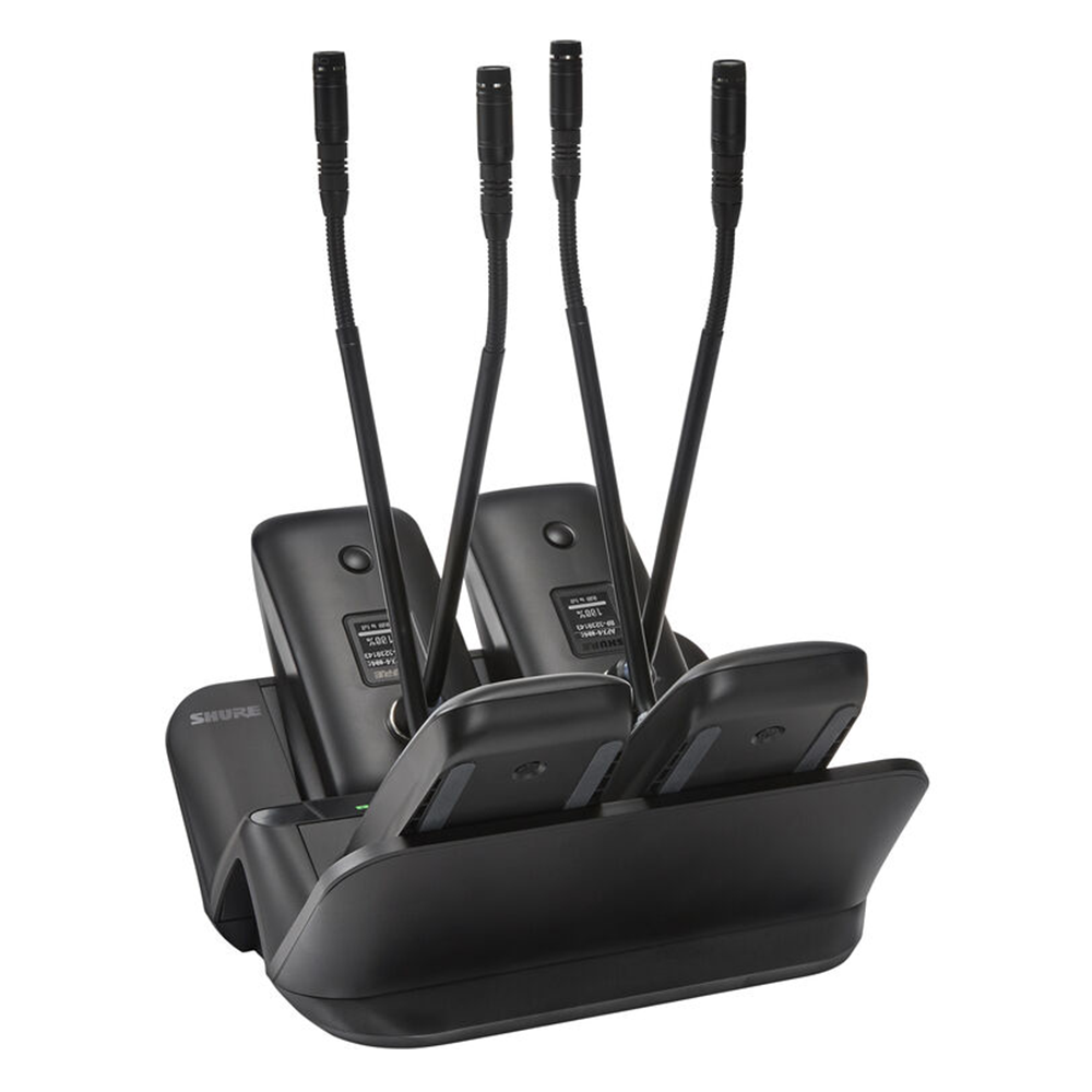 Shure MXWNDX4G — сетевая док-станция, позволяющая заряжать 4 передатчика MXW neXt без извлечения батареи. Совместима только с передатчиками MXW neXt с гибким штативом.