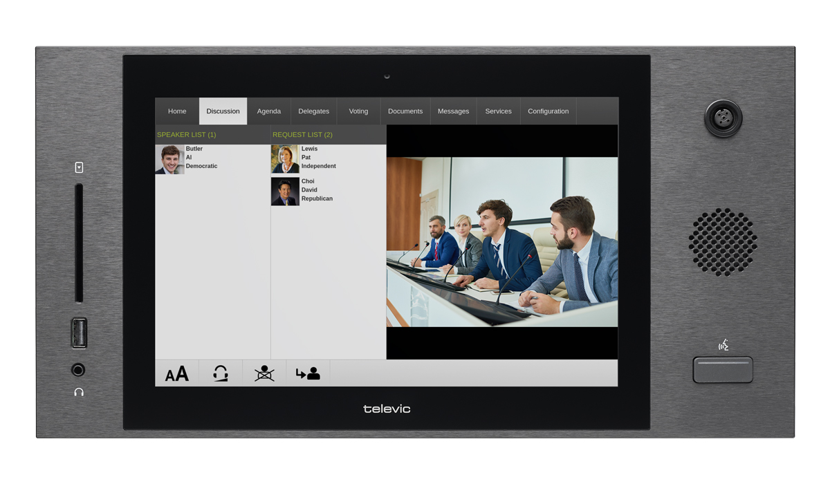 Каждый участник конференции получает доступ ко всей аудио- и визуальной информации через свой собственный блок uniCOS. Яркий 10-дюймовый сенсорный экран обеспечивает интуитивно понятный доступ к функциям: выбор видеопотока, обмен сообщениями и общение с другими участниками, просмотр повестки, информация о делегате, голосования и многое другое. Встроенная 5-мегапиксельная камера позволяет легко настроить видео с говорящими.